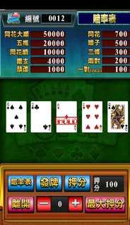 说明 妞妞「5PK」完美重現經典五張 撲克 遊戲( 梭哈 )。在遊戲中,玩家共有兩次機會取得中獎牌型,第一次先發出5張牌,您可使用手指點擊需要保留/放棄的牌張,確定選擇後按下「發牌」按鈕,即開始第二次發牌。 遊戲中還會出現Joker牌,大幅提昇中獎機率!一局牌、兩次機會,換牌?不換牌?考驗您的運氣與智慧! ※Joker牌為萬用牌,可代替所有的牌。 50級可以擁有至銀行與好友交易的功能 系統維護時間:每周四AM:9:00~AM12:00。