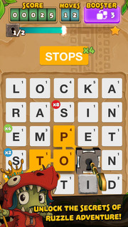 From the creators of one of the world 's most popular word games, Ruzzle, comes Ruzzle Adventure . Take part in the exciting adventure of magical worlds with hundreds of levels filled with mind boggling word puzzles. Can you escape the rising waters, unlock the locked letters or outsmart the Ruzzlers?
