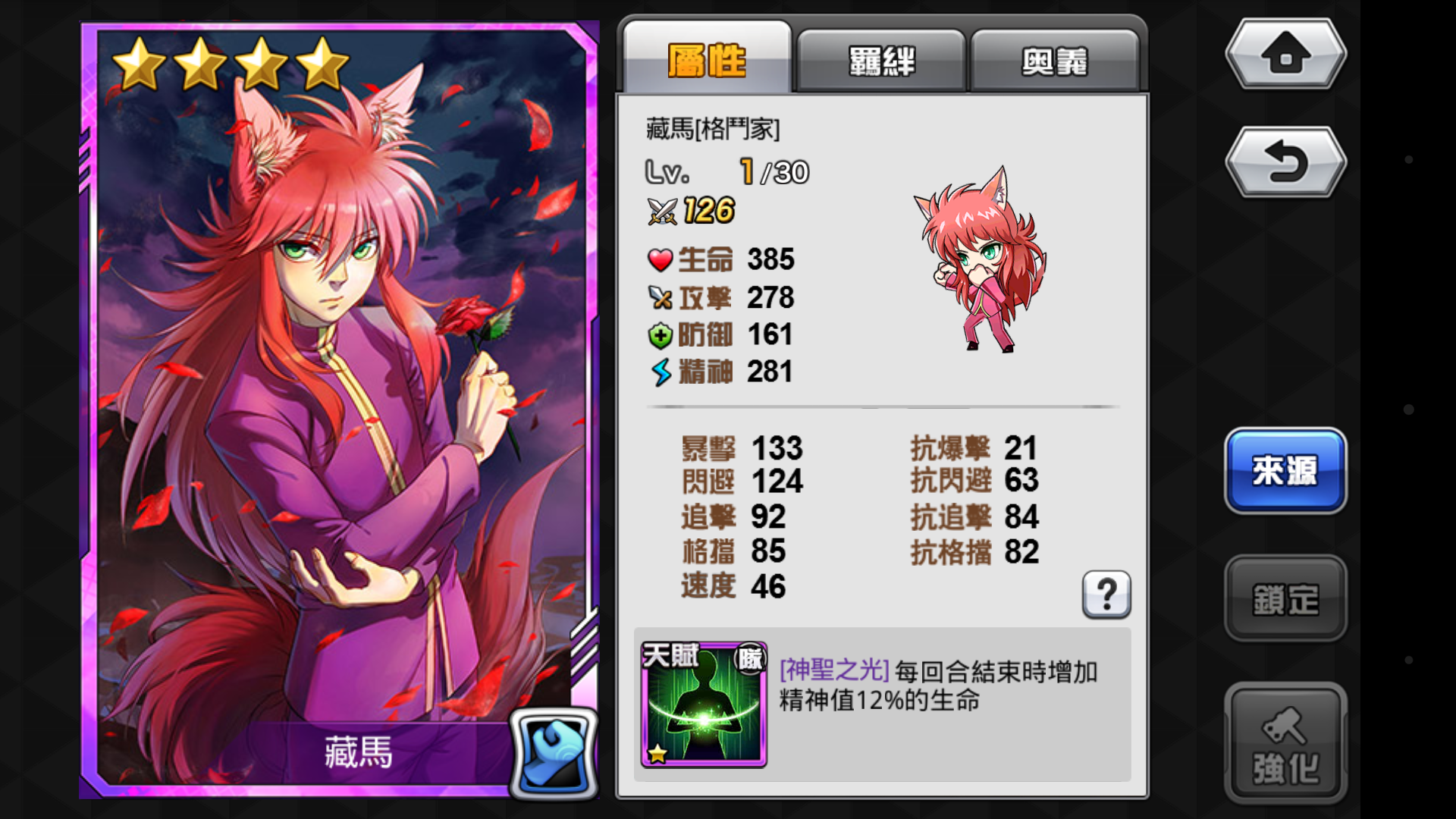 藏馬的屬性技能還算是比較優秀的,作為隊長每回合結束時就能增加精神值12%的生命,能抗能打,在前期能夠幫助玩家快速的升級推圖,是遊戲中四星英雄中作用非常大的角色了。當然,如果玩家前期運氣好抽到了愛德華那麼就用不到藏馬了。