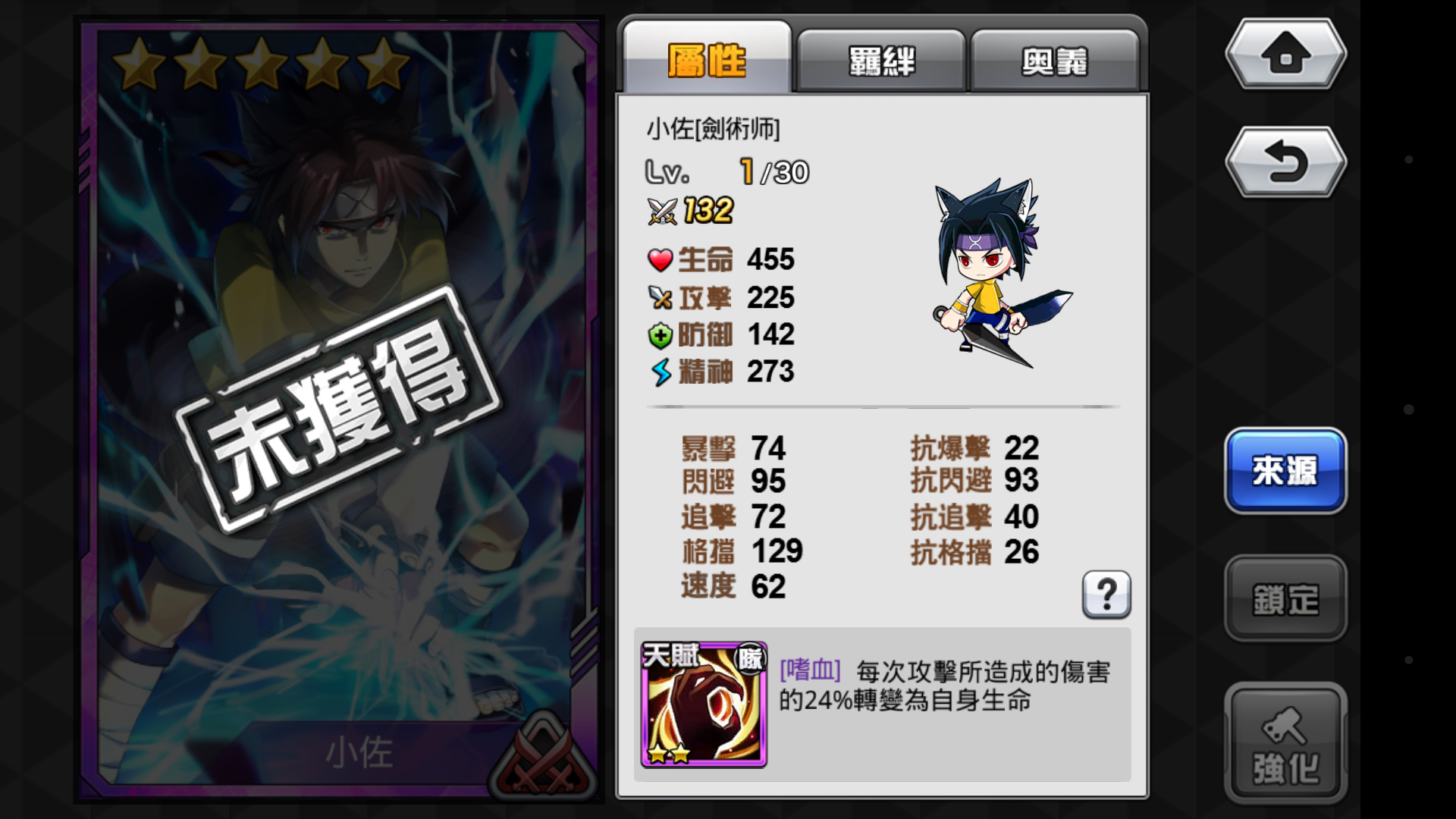 小佐的是遊戲中攻擊傷害十分強的五星劍術師,其作為隊長還能獲得嗜血這種十分逆天的技能。小佐的緣分羈絆也十分不錯,特別是搭配九尾、沙之子、奇犽這幾個英雄,效果極佳。