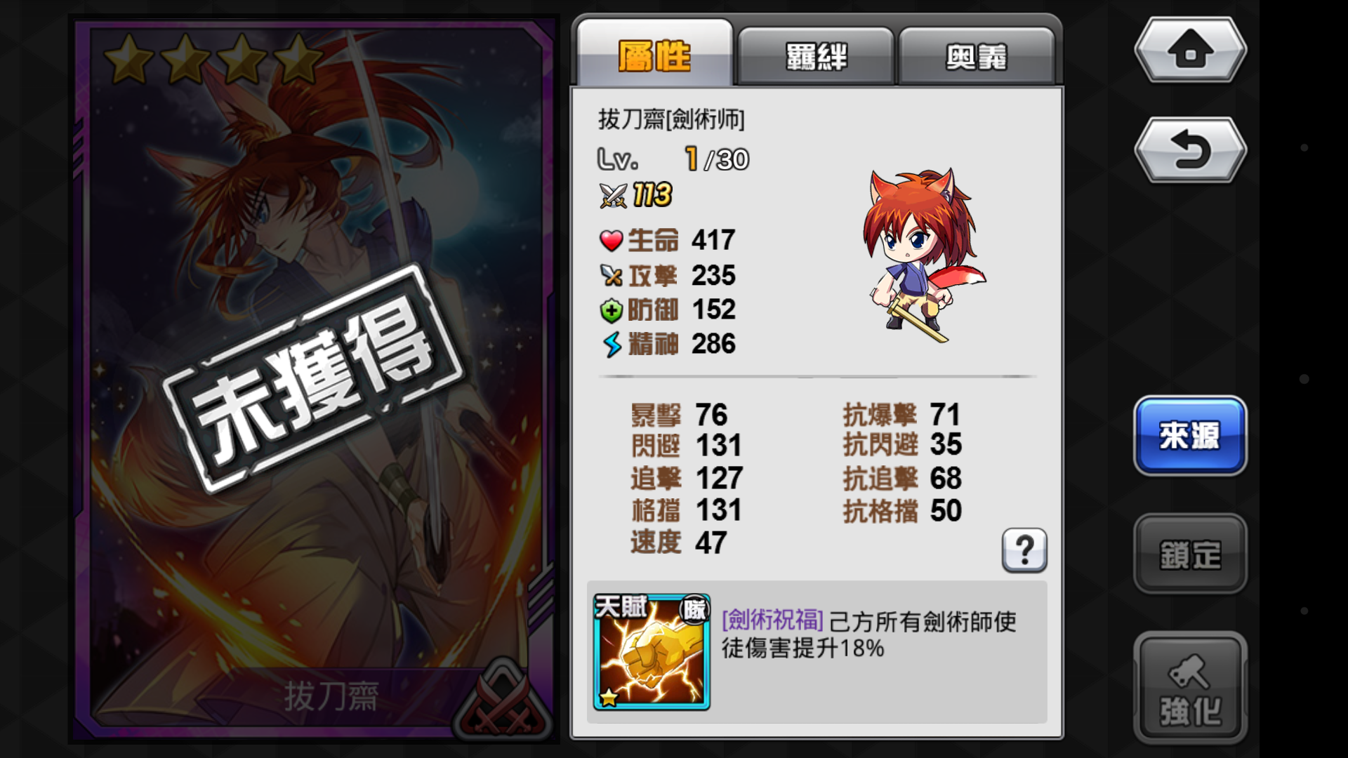 浪客拔刀齋不愧為一代劍客,雖然在COS大亂鬥遊戲中是4星劍術師,但無疑是四星劍術師中最強的一個。其天賦技能是提升我方所有劍術傷害的隊長技能,更有著十分不錯的奧義。緣分羈絆也很好搭配,搭配上綠藻頭和利威爾出戰前期基本沒有過不去的關卡,非常值得大家培養。