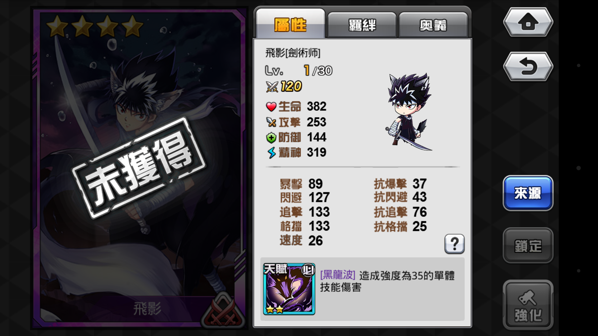 飛影在遊戲中是四星劍術師,雖然是四星劍術師,但其攻擊力卻十分強大,特別是跟浦飯幽助一起搭配上陣時,戰鬥力極強。如果玩家能給飛影裝備好技能和專屬,飛影戰鬥力完全不輸一般的五星英雄。