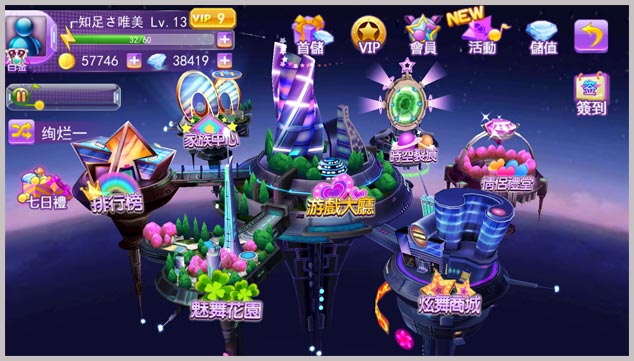 登錄遊戲界面後,首先展現在我們面前的就是天天炫舞的世界哦!由於現在已經到了火熱激情的夏天,所以遊戲裏的場景也是清涼壹夏的感覺,很應景的有木有?不過,增加了壹份羅曼蒂克的氛圍各位新手友友們感受到了嘛?然後看右邊最下面有壹個扭蛋按鈕點擊以後雜特定的時間裏面是可以進行抽獎的哦,上面是我們的活動按鈕,如果想了解我們最新活動的小夥伴們壹定呀記得點擊此按鈕看下有沒有自己喜歡的活動哦。活動按鈕旁邊就是我們的充值按鈕,方便大家購買。中間的炫舞廣場又分為遊戲大廳、炫舞商城、舞魅花園、情侶禮堂、時空裂痕、家族中心、達人行榜。關於這七個部分以後的資訊小編會仔細介紹。特別提醒您壹下這裏有壹個簽到按鈕,每天登陸記得簽到哦,我們會提供好多豐富的獎品給到您的。