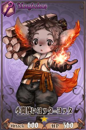 | 簡介 | ユグドの南方、迷宮山脈に住まう火妖精の子供。世界の危機にあって、すこしでも世の役に立とうと、人里に出て鍛冶屋のお手伝いをしている。 いい武器を作るため、職人のもとで毎日のように火起こしをしているうちに、人間の魔法使いを凌ぐほどの炎の使い手になっているのだが、本人は全く気付いていない様子。 |
