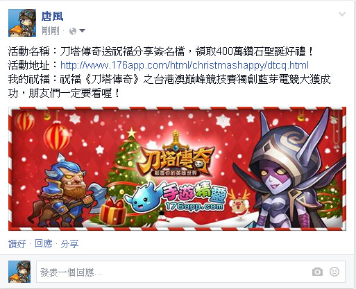 活動名稱:刀塔傳奇送祝福分享簽名檔,領取400萬鑽石聖誕好禮!