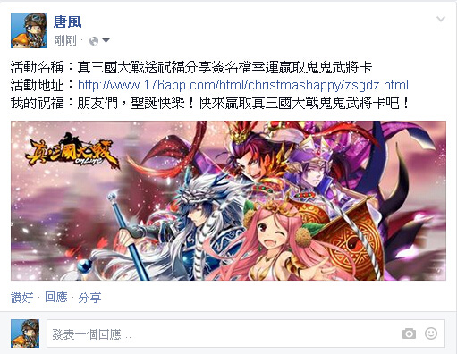 活動名稱:真三國大戰送祝福分享簽名檔幸運贏取鬼鬼武將卡