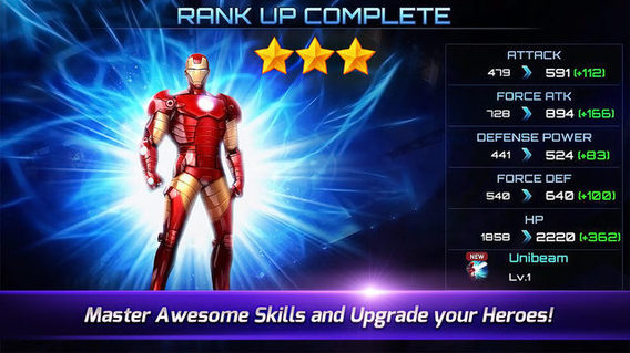 使用鋼鐵人、美國隊長、浩克等復仇者聯盟的英雄,當然還有像是蜘蛛人、黑天使、惡靈戰警等MARVEL Universe的超級英雄和其他反派勢力組成專屬於我的隊伍,利用強化各英雄的固有技能和裝備讓隊伍變得更強大。