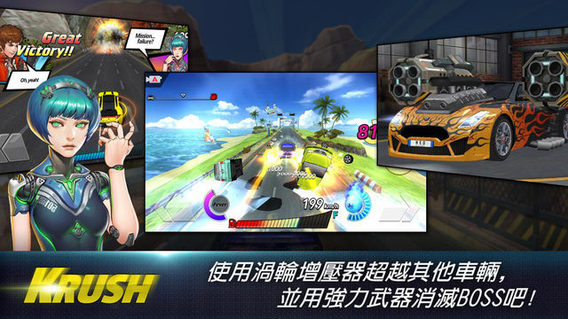 在壅擠道路上實現只存在於想像中的超車並使用渦輪增壓急速奔跑前進吧!多到數不清的車手、行動、比賽都在 Rush N Krush !