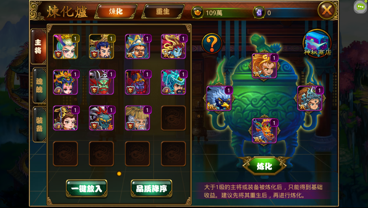 在煉化爐界面的上方,玩家可以看到重生按鈕。重生針對的是已經升級或已經鍛造後的裝備。通過重生,玩家可以獲得一部分強化裝備時的金幣,已經裝備進階時的喂靈石。而卡牌重生,則會返還玩家1級的卡片,和卡片原來同等經驗值的經驗丹。但值得注意的是,卡牌重生後將回到原始狀態,並不會返還卡牌進階時所消耗的進階丹。