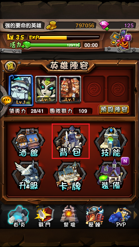 1) 在戰鬥中掉落的裝備會進入首頁的「背包」