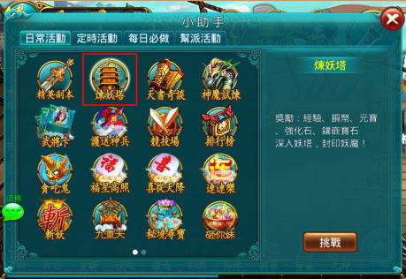 煉妖塔出產大亮強化石、寶石及其他獎勵。