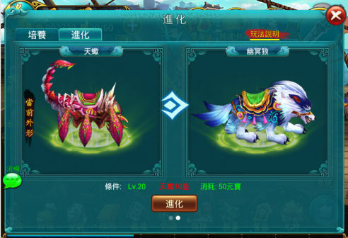 3、騎寵可以通過培養提升所加成的屬性和移動速度;每日可使用元寶和銅錢進行騎寵培養,培養星級達到一定等級後可以進化,進化可獲得更帥氣的造型和提升可享有騎寵加成屬性的上限;