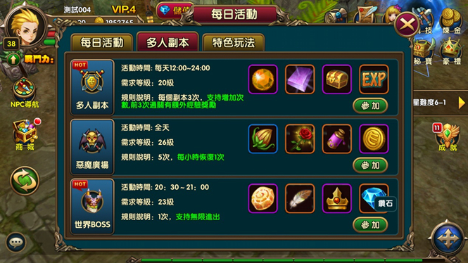 世界BOSS為一個日常活動,玩家可以在每天的20:30-21:00的日常活動中參加世界BOSS的活動,該活動只對23級以上的玩家開放,低於23級的玩家是無法參加活動的,進入該副本的所有玩家將會對同一個BOSS進行攻擊,系統將會記錄玩家對BOSS造成的傷害進行統計排名,造成的傷害越高獲得的獎勵越豐厚,在副本中死亡後傷害不會清零,死亡的玩家可以在復活後再次進入該副本繼續對BOSS造成傷害,直至BOSS死亡後活動結束。每次將BOSS擊殺後BOSS本身的等級會提升,等級越高的BOSS獎勵越豐厚,但是BOSS攻擊也會提高。