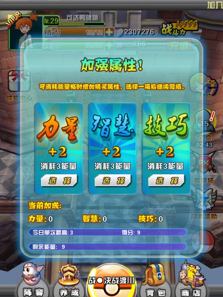 每挑戰3層就會出現這個加強屬性提示,這個加強屬性也就是增加寵物的屬性,這個可以自行選著來進行分配,上面都會有提示這個選著哪個以及需要消耗的能量,這個能量可使用的,也能在提示當中的下方查看到,能量的獲得就是每層都會進行獎勵。