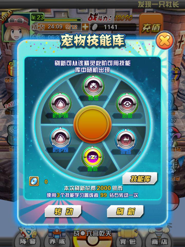 首先要給大家接收一下《口袋精靈3D》新版本的技能系統。新版本的技能系統,技能不再由抽卡獲得。精靈進階到一階之後才會開啟更換技能的功能,玩家可以在技能庫中通過指針來隨機獲得技能庫中的技能,如果轉到你想要的技能可以選擇保留,否則放棄。轉動轉盤需要道具技能學習器,技能學習器可以在探索中、副本通關獎勵、寶箱