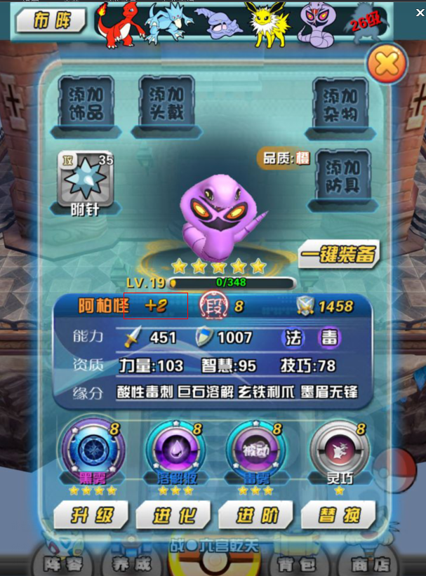 技能也是有分普、超、毒、草、水、火、超的哦,他也是有關係到每個精靈這個系列以及這個屬性,這樣也是更好的提高精靈的這個效果,大家也知道這個精靈是有一定的相關剋制關係,雖然目前體現不是非常大,但是多多少少還是有的!技能的合理運用也是非常重要的,例如一些有暈眩效果,和減少/增加免傷或者攻擊,都是能給予我們在關卡和副本以及這個競技場等戰鬥帶來不同的效果幫助的!