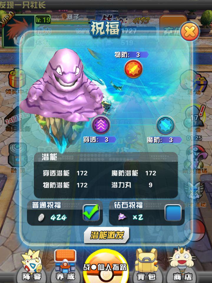 宠物潜能激发:游戏中,宠物可以通过祝福来进行潜能激发提升不同的属性,例如:穿透、魔防、物防