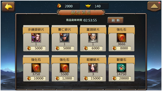 獎勵兌換:點擊獎勵兌換進入獎勵兌換頁面,可以通過軍功兌換需要的武將經驗、強化石、武將碎片、士兵碎片等。