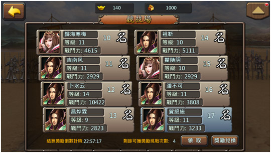 競技場挑戰獎勵:競技場挑戰不管成敗,都可以獲得軍功和銅幣。