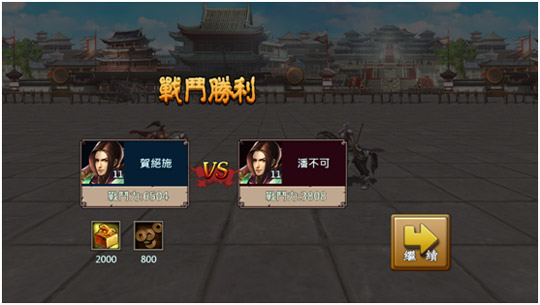 挑戰勝利:舉例~挑戰常潘不可,確定後,進入競技場挑戰,挑戰勝利後:戰鬥獎勵,軍功2000,銅幣800。