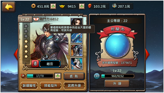 經驗池可以存放通用武將經驗,用來為武將升級時提供經驗,經驗池的上限會陏著玩家等級提升而提高。經驗池中的經驗可以通過完關卡或者寶箱等等途徑獲得。