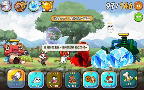 關卡進行時,當發現魔王軍過於強大無法對抗!勇者可以根據目前的等級來調整隊伍陣容、提升英雄等級、提升科技或是邀請好友一同來協助戰鬥。