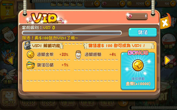 成為VIP之後會獲得各種回饋,幫助勇者更快速的升級、提高過關獲得的金幣及經驗值,而且下次再儲值的時候,也會獲得更多的寶石唷!