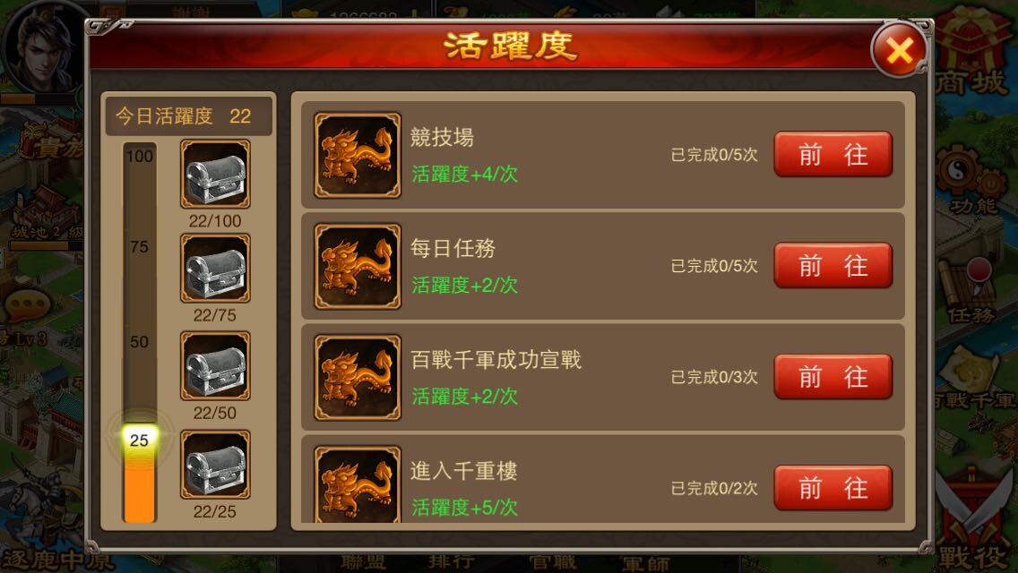 遊戲內完成對應的任務會增加君主活躍度,達到25、50、75、100時活躍度可領取對應的獎勵唷~