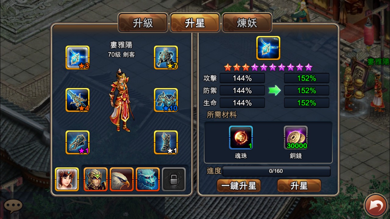 選中左側主角或傭兵身上的裝備,點下“升星”按钮,如果材料齊全則升星成功。