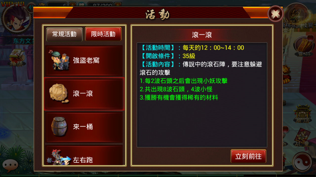 2.滾一滾:每日12:00-14:00開放,35級可參加滾石躲避戰,獲勝可取得稀有材料。