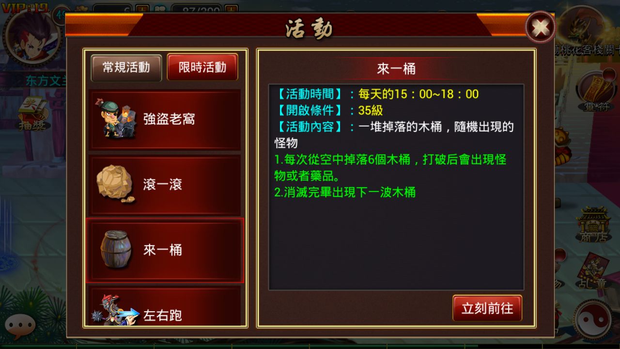 3.來一桶:每日15:00-18:00開放,35級可參加天降大木桶,打破木桶後隨機出現怪物或者藥品。