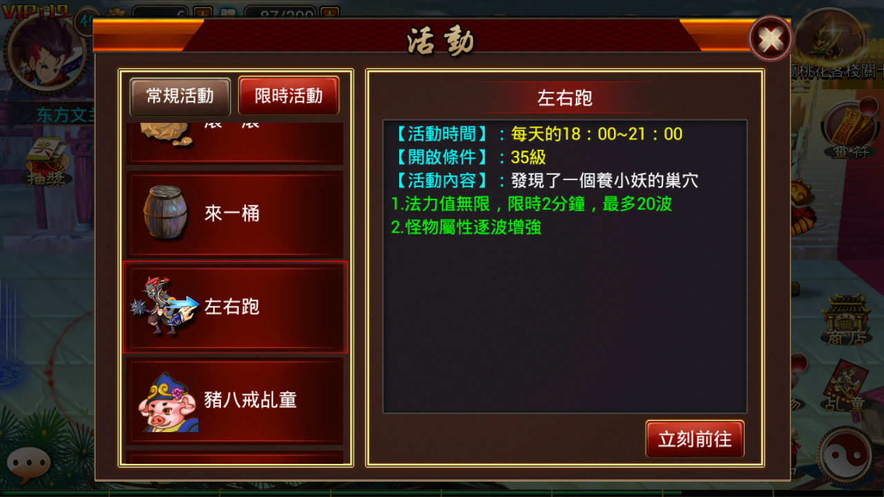 4.左右跑:每日18:00-21:00開放,35級可參加,玩家將會發現一個培養小妖的巢穴,利用無限法力值盡情的施放技能攻擊吧。