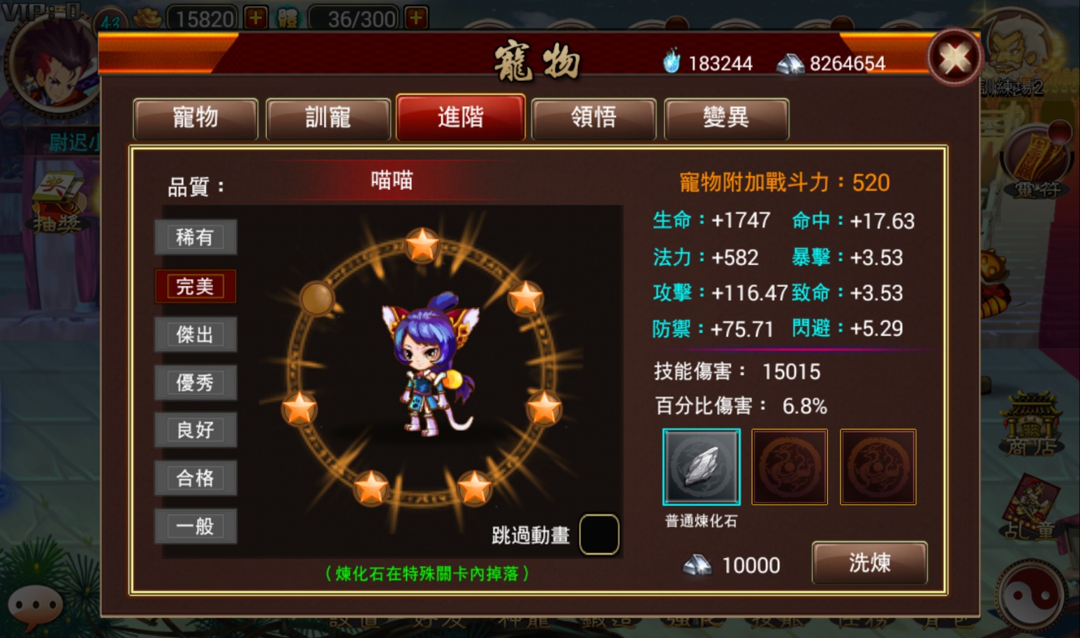 2.要洗寵物的品質,必須利用煉化石,每次洗也需要扣除一定的金錢。煉化石分 普通煉化石和高級煉化石,每次