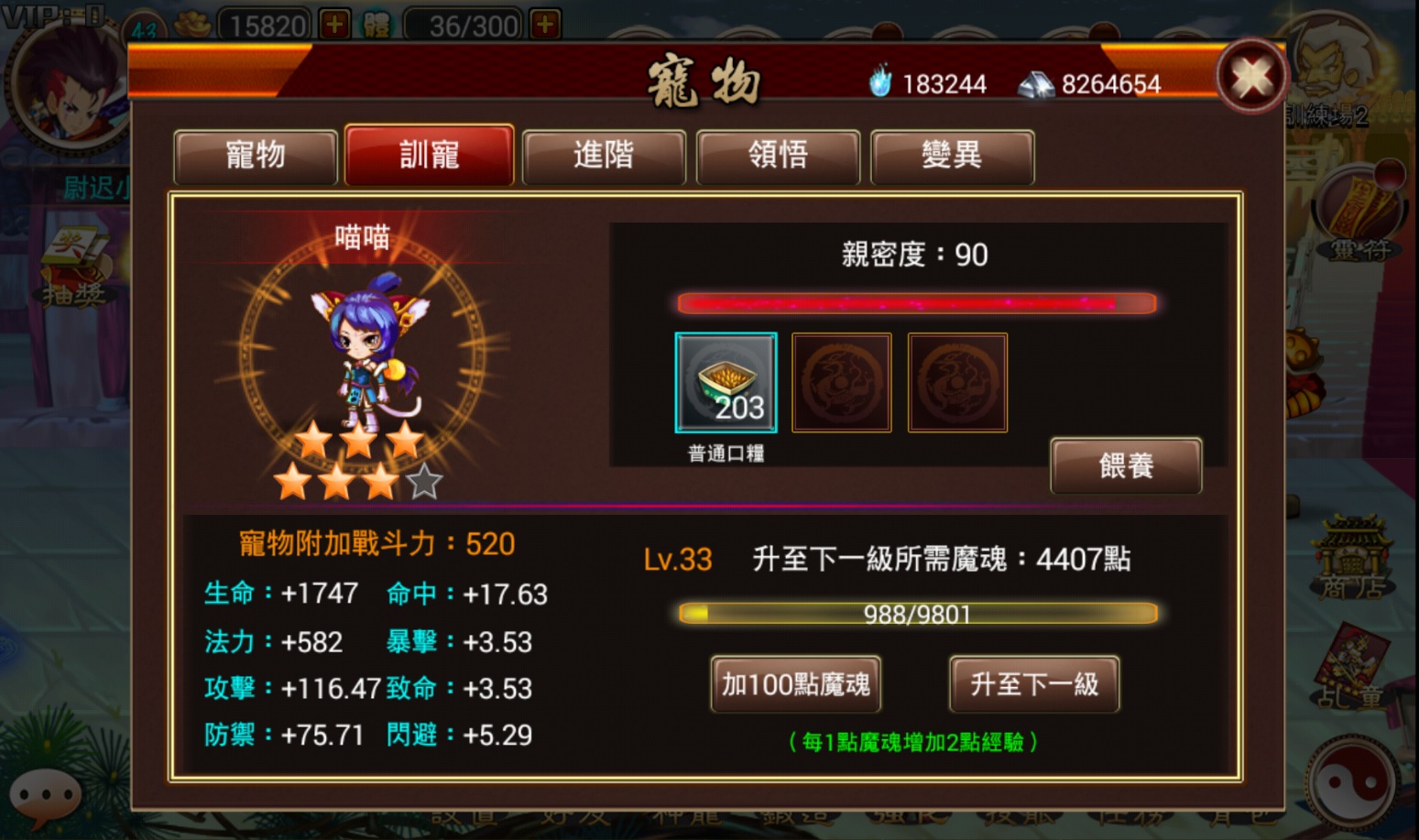 等級:寵物的等級提升需要玩家帶著進入關卡戰鬥,也可以通過消耗魔魂提升,此外寵物等級影響對玩家屬性的