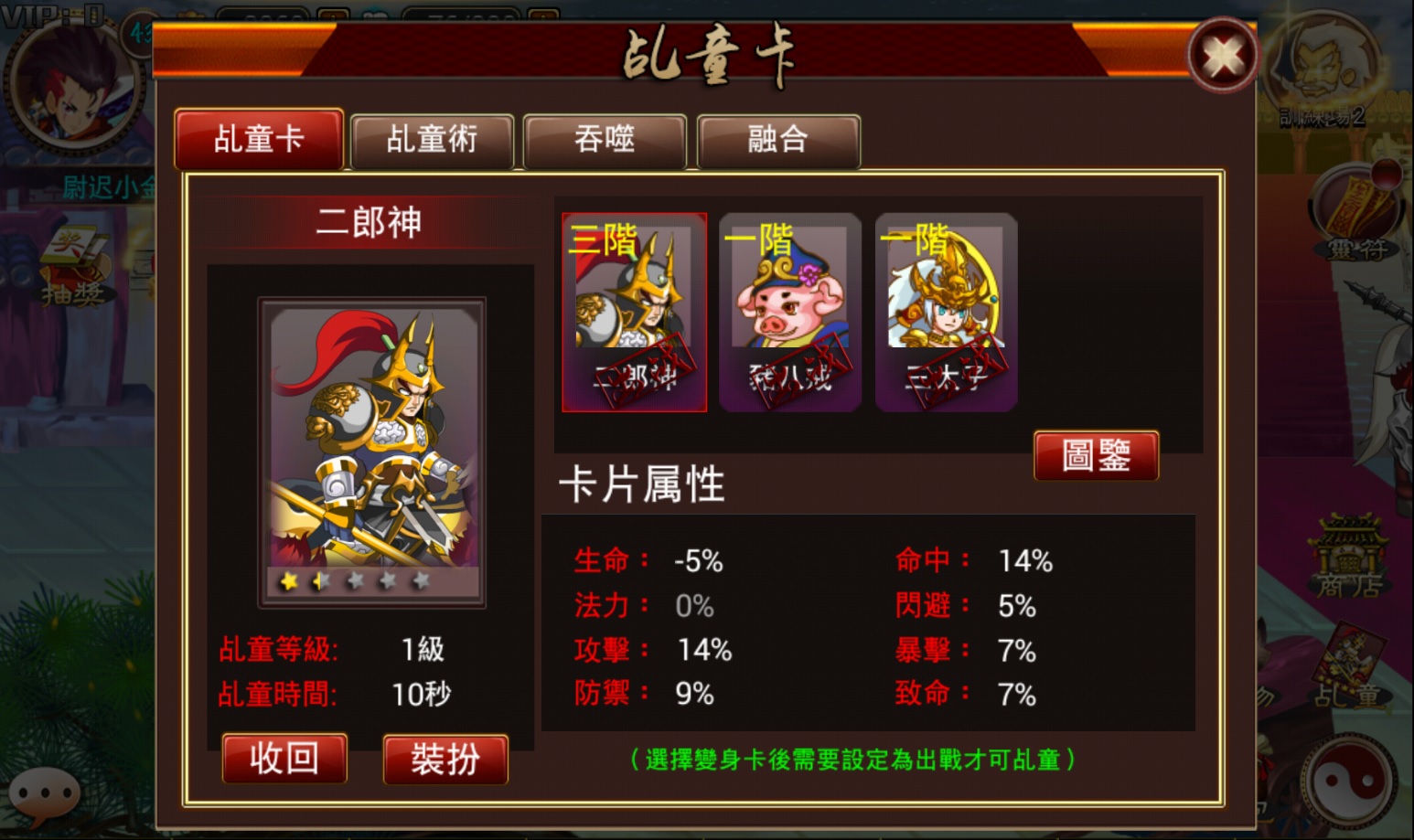 除了二郎神附身是天生攜帶具備,其它乩童卡需要類似寵物一樣放在背包中,只有使用之後學習才能進入乩童卡槽,然後可以培養附身。