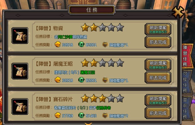 每個陣營任務的獎勵星級是隨機刷出的,1到5星獎勵依次增加,玩家每天有5次免費刷新陣營任務的機會。