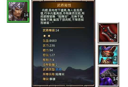 此時,裝備等級提升後,高順武將氣血增加231點,體力增加屬性15點