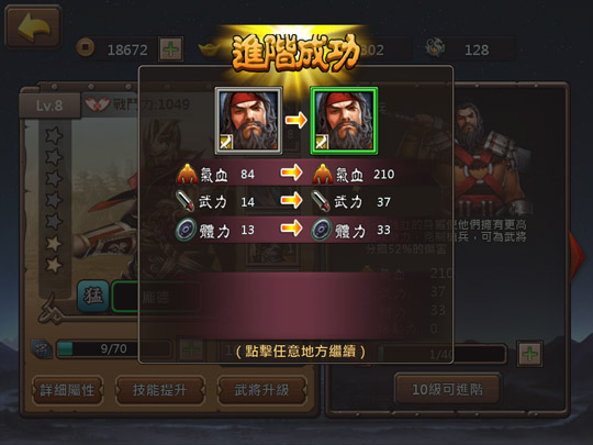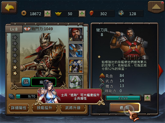 兵種進階後屬性會大幅提升,但是不會提升為武將分擔傷害的百分比。