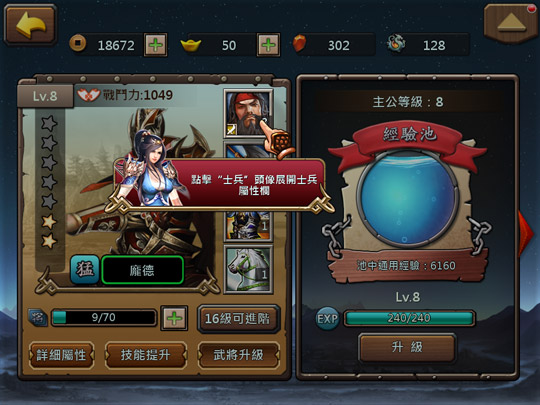 玩家在8級時開啟兵種進階,在武將介面中點擊”士兵”頭像展開士兵屬性欄,在屬性欄中可以查看該兵種目前的屬性。