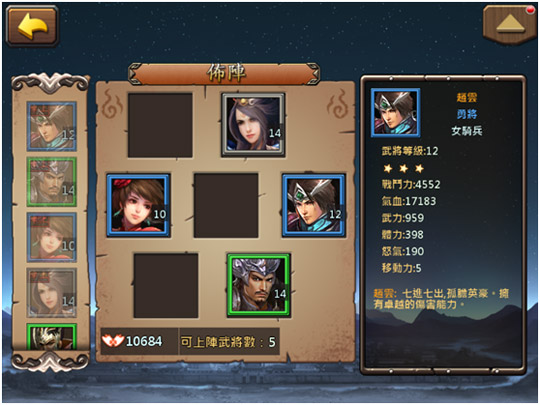 佈陣在主線任務情節中,也是很早就會開啟一個重要系統。這裡是可以調兵遣將的哦,武將上陣,拖動武將頭像,到佈陣位置,即可完成佈陣。