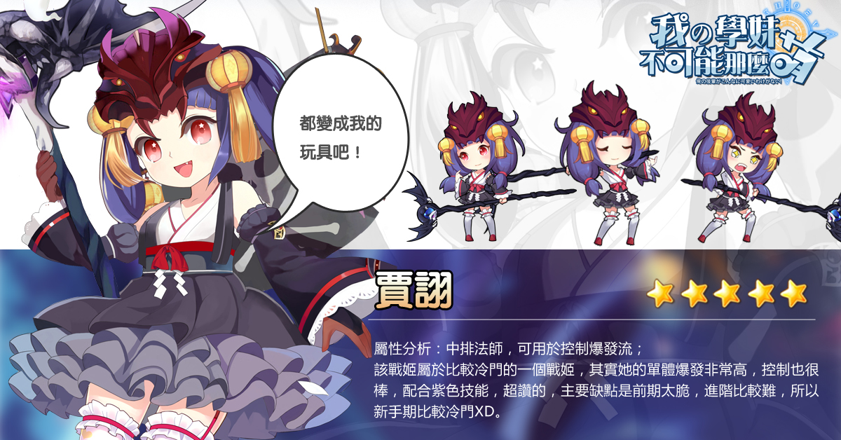 總的來說賈詡還是屬於一個比較冷門的戰姬,很多玩家都有但是沒有培養。其實賈詡的單體爆發非常高,也有不錯的控制,配合紫技能那爆發直接爆炸。主要問題還是在於太脆,很有可能放不出大招就死了,而且進階不易,所以不建議新手使用和培養。