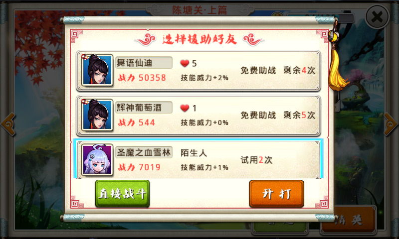 副本對戰中,選擇副本後,開始戰鬥前,會彈出助戰好友列表。(在第二章第六戰後開啟)
