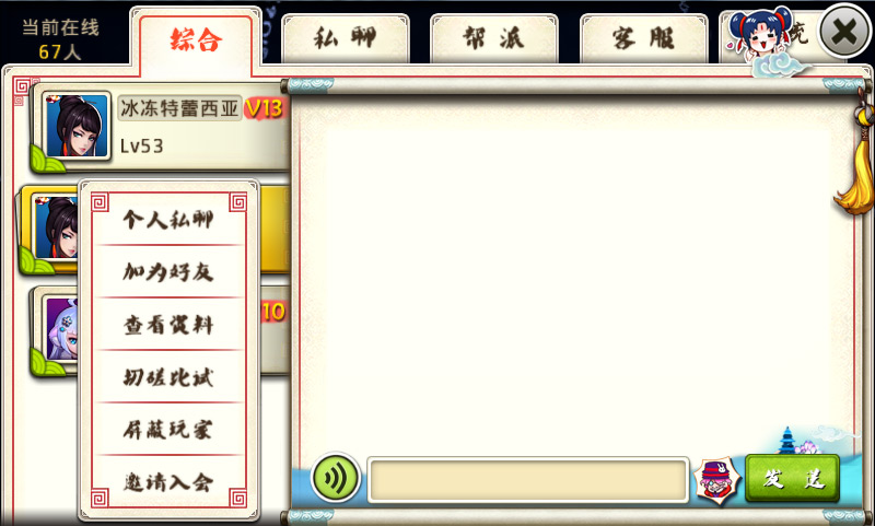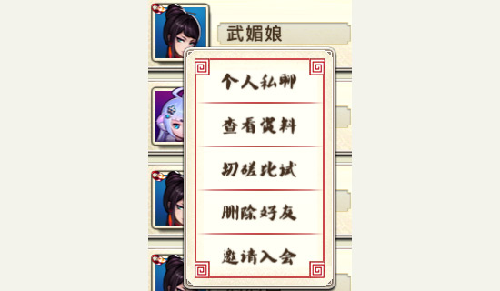 功能:聊天、查看資料、切磋比武、邀請入會、查看好友度。