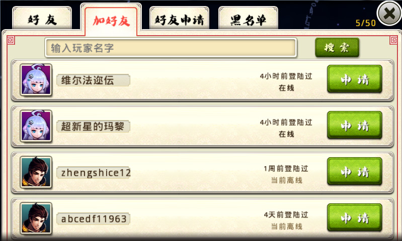 列表之中隨機刷出遊戲玩家,可以點擊申請進行好友申請,得到對方同意後就會成功添加對方為好友。通過上方的搜索欄,可以查找到指定的玩家。