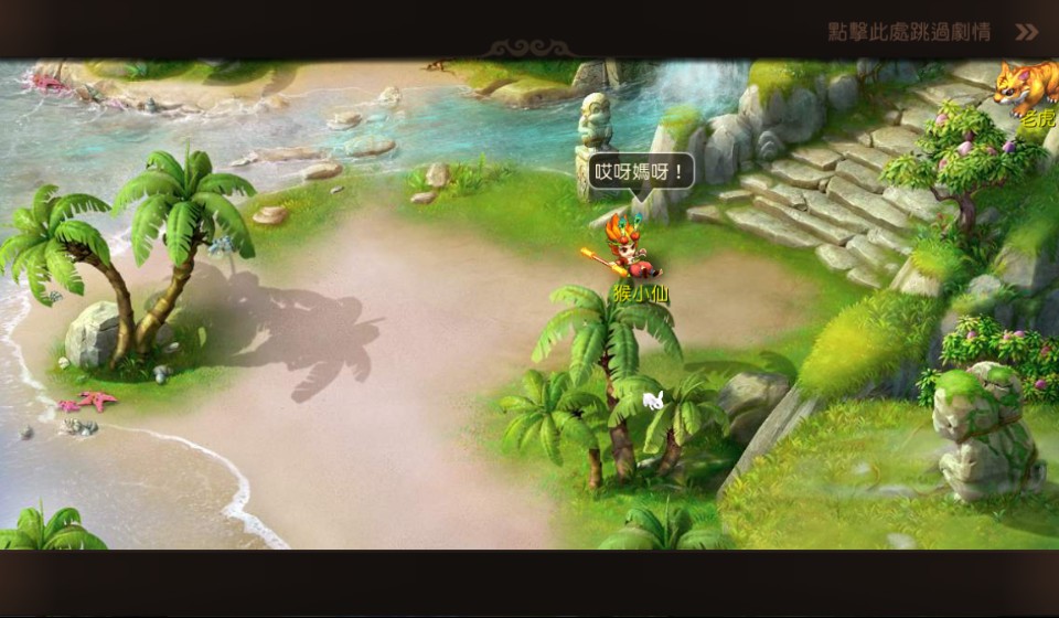 在花果山四處尋找草藥,撞見猴小仙正被斑斕猛虎追趕。將猴小仙救下,他連連表示感謝,還帶你去找侯醫仙,得到了餐風飲露,將法明長老治癒。