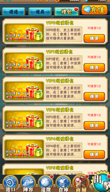 VIP7禮包:橙色艦娘藍圖x1高級精煉書x50寶物精煉書x50彈藥包x10 資金x100萬