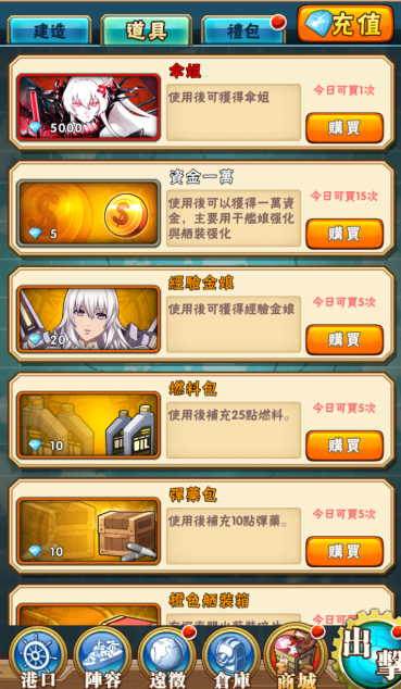 道具: 玩家可以購買經驗金娘,燃料包,彈藥包,橙色舾裝箱,橙色寶物箱,出擊令,大免戰旗,小免戰旗,和核心源等輔助類道具。