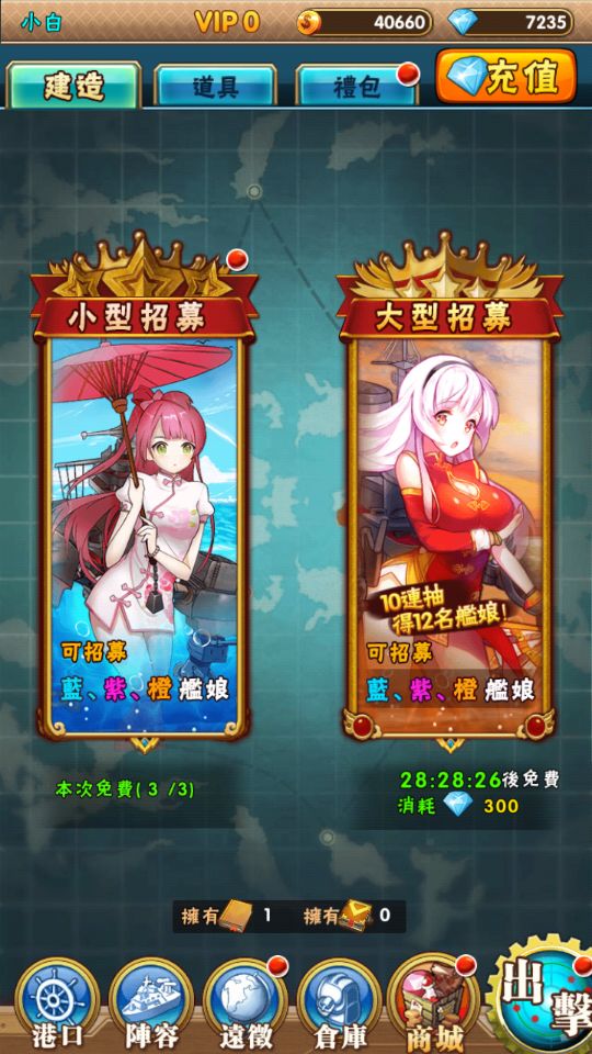VIP0禮包:紫色艦娘藍圖x1 培養液x50 大型開發書x1 燃料包x2 資金x5萬