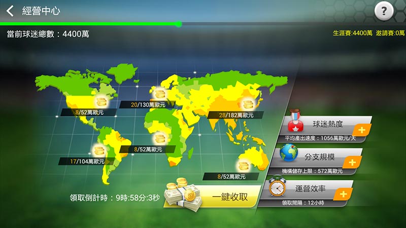 2. 邀請賽:邀請賽增加的球迷每天都會重置,而增加每天的歐元收入也主要靠這部分。我會在每天能夠領取各地產出的歐元之前,集中時間打邀請賽,把這部分的球迷數增加到上限(800萬),然後再去領取獎勵;
