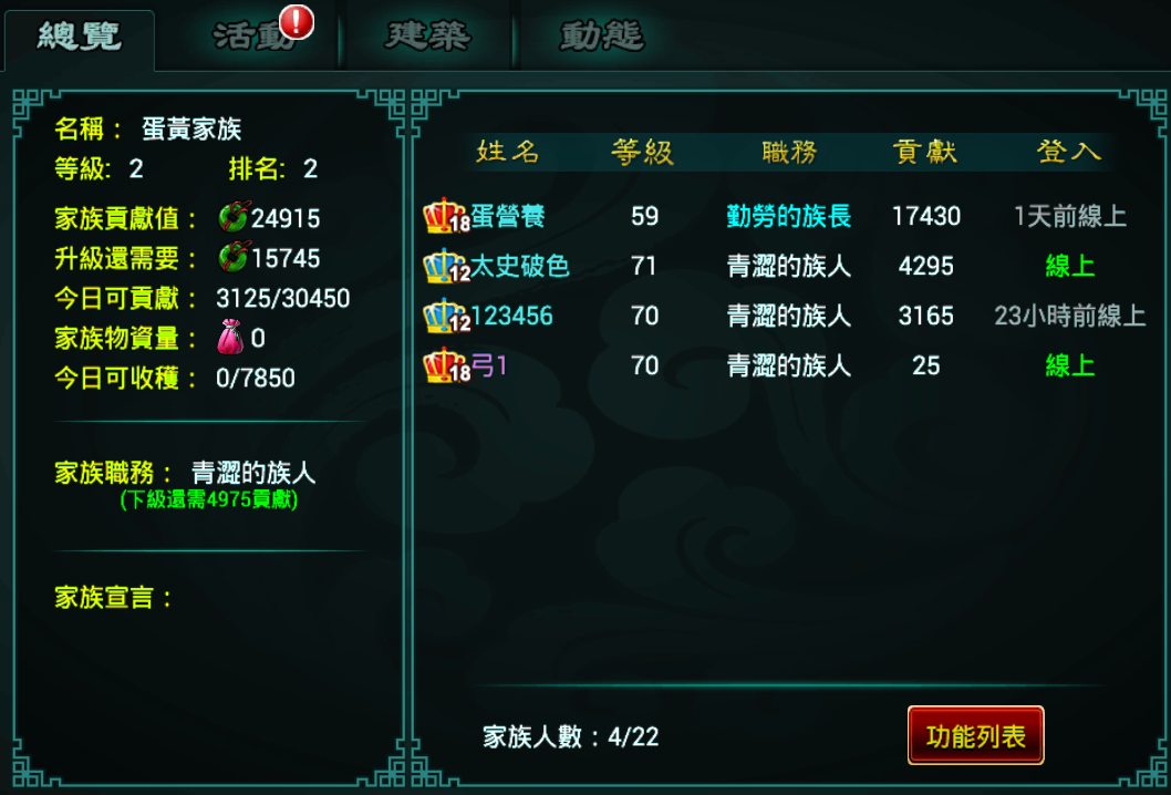 3、玩家本身沒有加入任何家族、幫會。